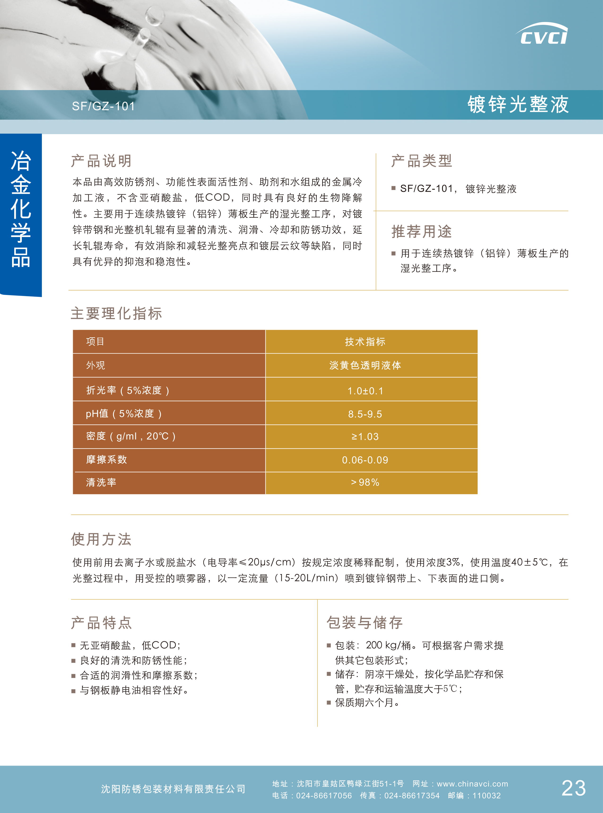 由高效防銹劑、功能性表面活性劑、助劑和水組成的金屬冷加工液,不含亞硝酸鹽,低COD,同時具有良好的生物降解性。主要用于連續熱鍍鋅(鋁鋅)薄板生產的濕光整工序,對鍍鋅帶鋼和光整機軋輥有顯著的清洗、潤滑、冷卻和防銹功效,延長軋輥壽命,有效消除和減輕光整亮點和鍍層云紋等缺陷,同時具有優異的抑泡和穩泡性。