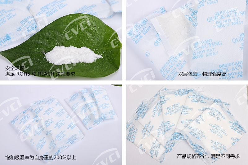 速效干燥劑是以高效活性吸附物為原料,經精確計算,科學調配后組成。包裝采用杜邦紙與高級無紡布雙層包裝,印刷精美,使用方便。該產品規格齊全,可滿足不同產品的防潮、防銹包裝需求。